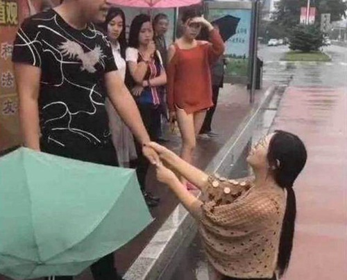 Gần đây, cư dân mạng Trung Quốc đang lan truyền những hình ảnh về một tình huống éo le, gây xôn xao dư luận. Một cô gái trẻ bất chấp mưa gió, quỳ xuống khóc lóc thảm thiết, ôm chân bạn trai, cầu xin anh đừng chia tay mình.
